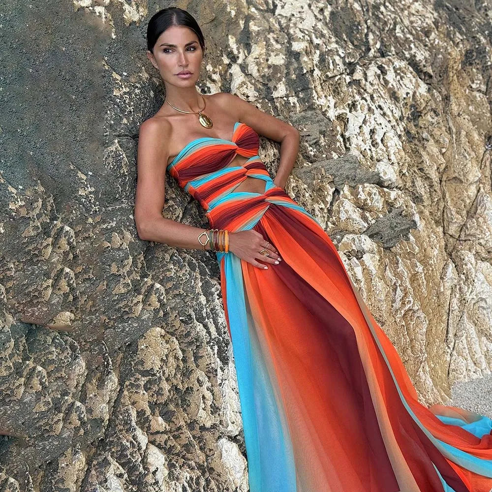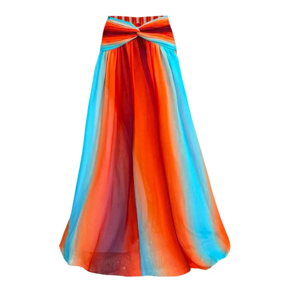 - Design: Langer Rock und Bodysuit mit „Tramonto“-Print (Orange-, Terrakotta- und Türkisakzente)